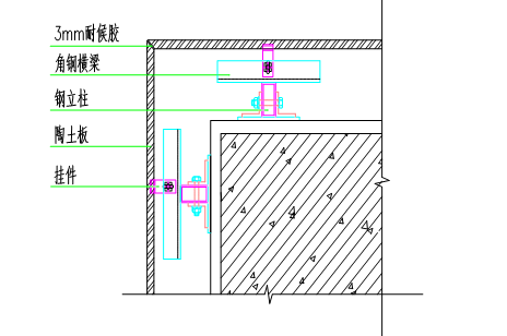 2、用螺栓穿過掛件安裝孔和絕緣墊片固定到橫梁上,螺栓先不擰緊,待陶土板檢查調(diào)整平整度后再擰緊。