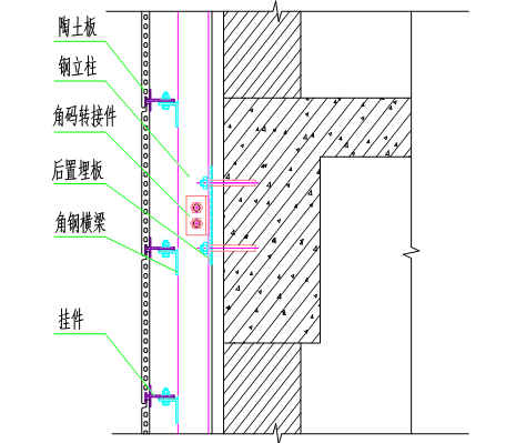 干掛陶土板幕墻施工技術是預先運用CAD軟件繪制排版分格圖,工廠機械化加工裁切成型,采用鋼龍骨掛件式安裝系統;施工現場在主體結構上安裝后置埋件,通過角碼專家豎向龍骨與埋件連接固定,采用焊接連接將角鋼橫梁固定在豎龍骨上,通過掛件把陶土板固定在橫梁,掛件與橫梁之間采用柔性絕緣墊片隔開,掛件與陶土板之間打耐候膠固定。